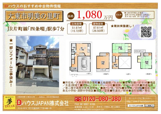 交通:JR片町線「四条畷」駅歩7分